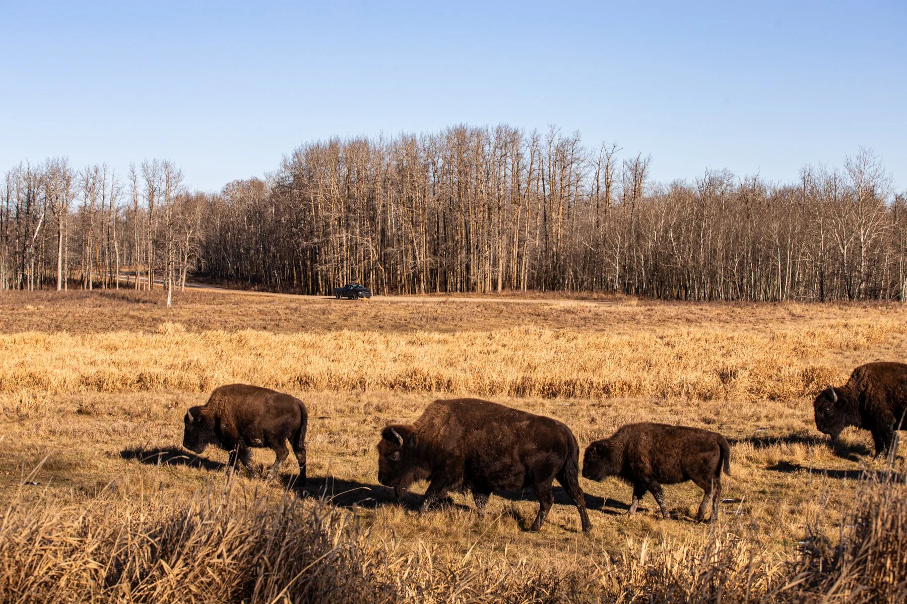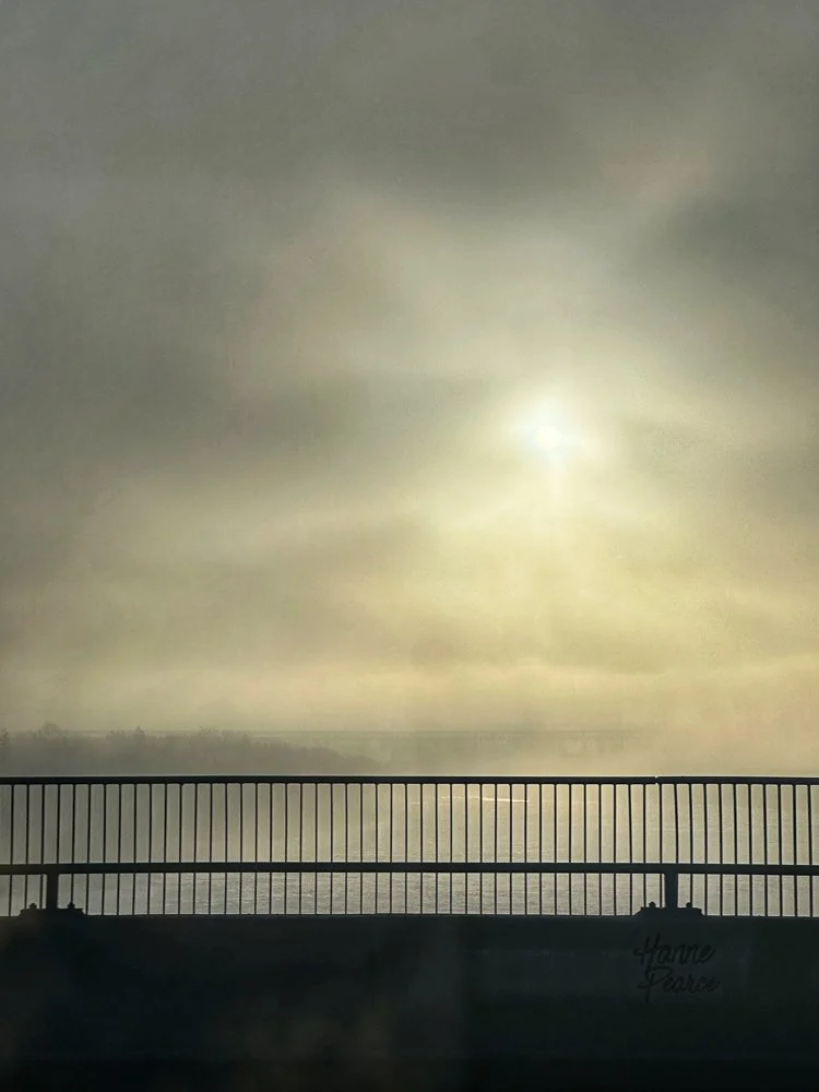 The Edmonton skyline reflects on the glass of the LRT window when crossing the Tawatina Bridge.