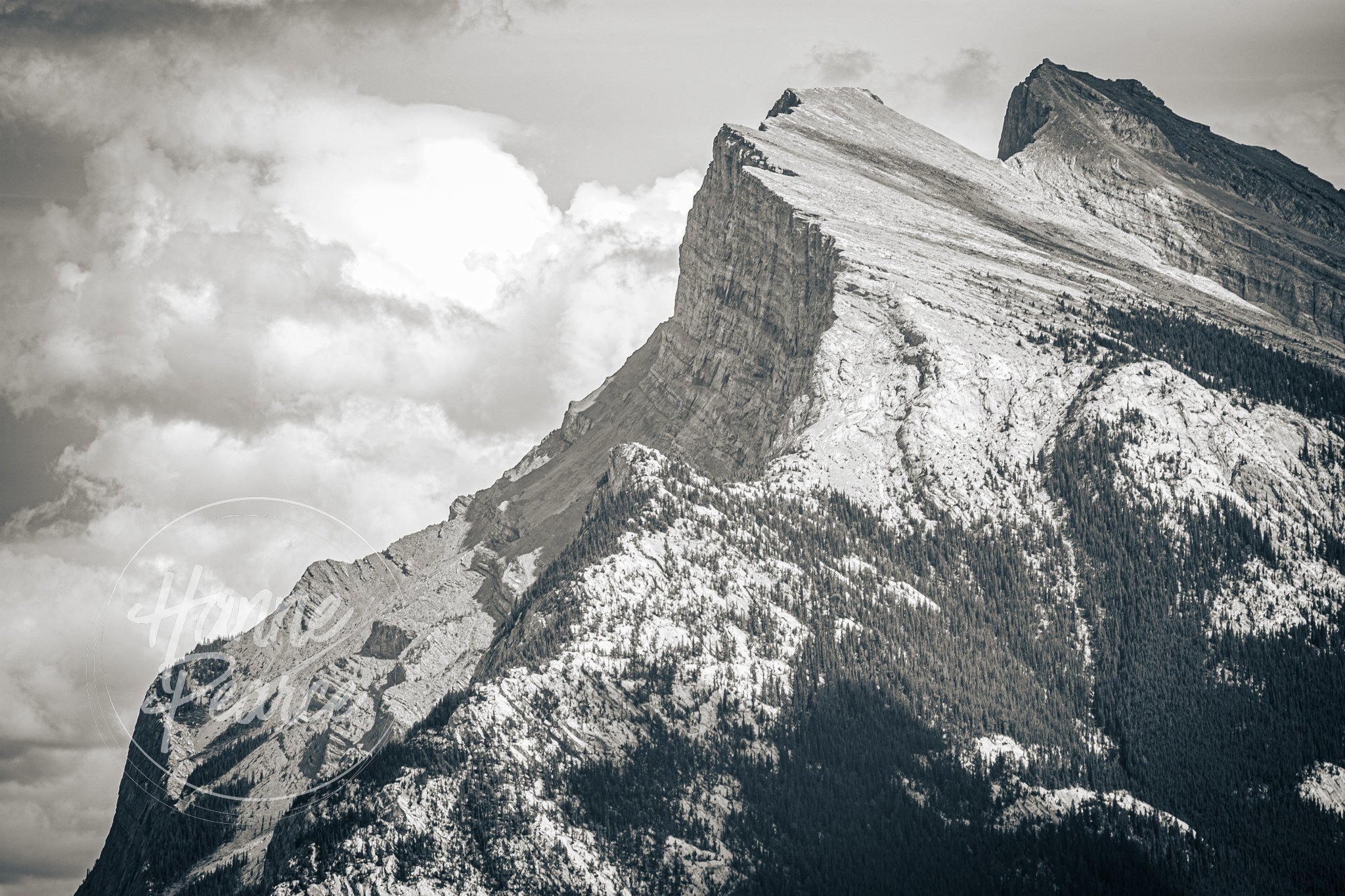 I have a close attachment to the Banff Area, having grown up in Calgary in the 80s. Waskahigan Watchi, (Mt. Rundle) is an old friend that I have photographed many times. In July I took a day trip with a friend, and captured this grittier monochrome with the telephoto, using the hood of the car as support.